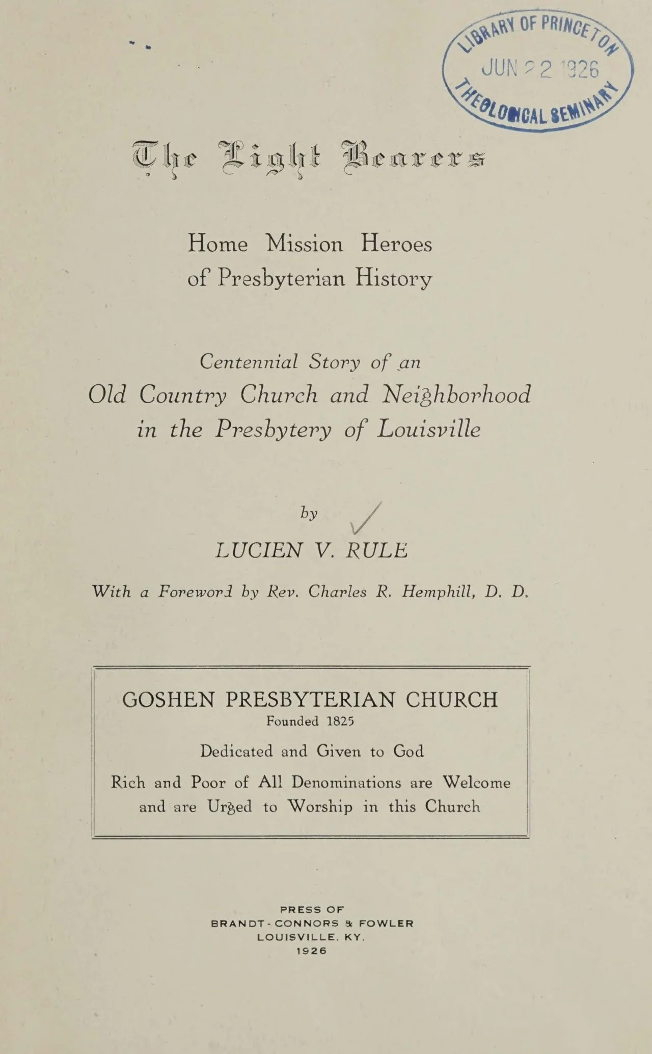 The Light Bearers: Home Mission Heroes of Presbyterian History - Centennial Story of an Old Country Church and Neighborhood in the Presbytery of Louisville (1926)