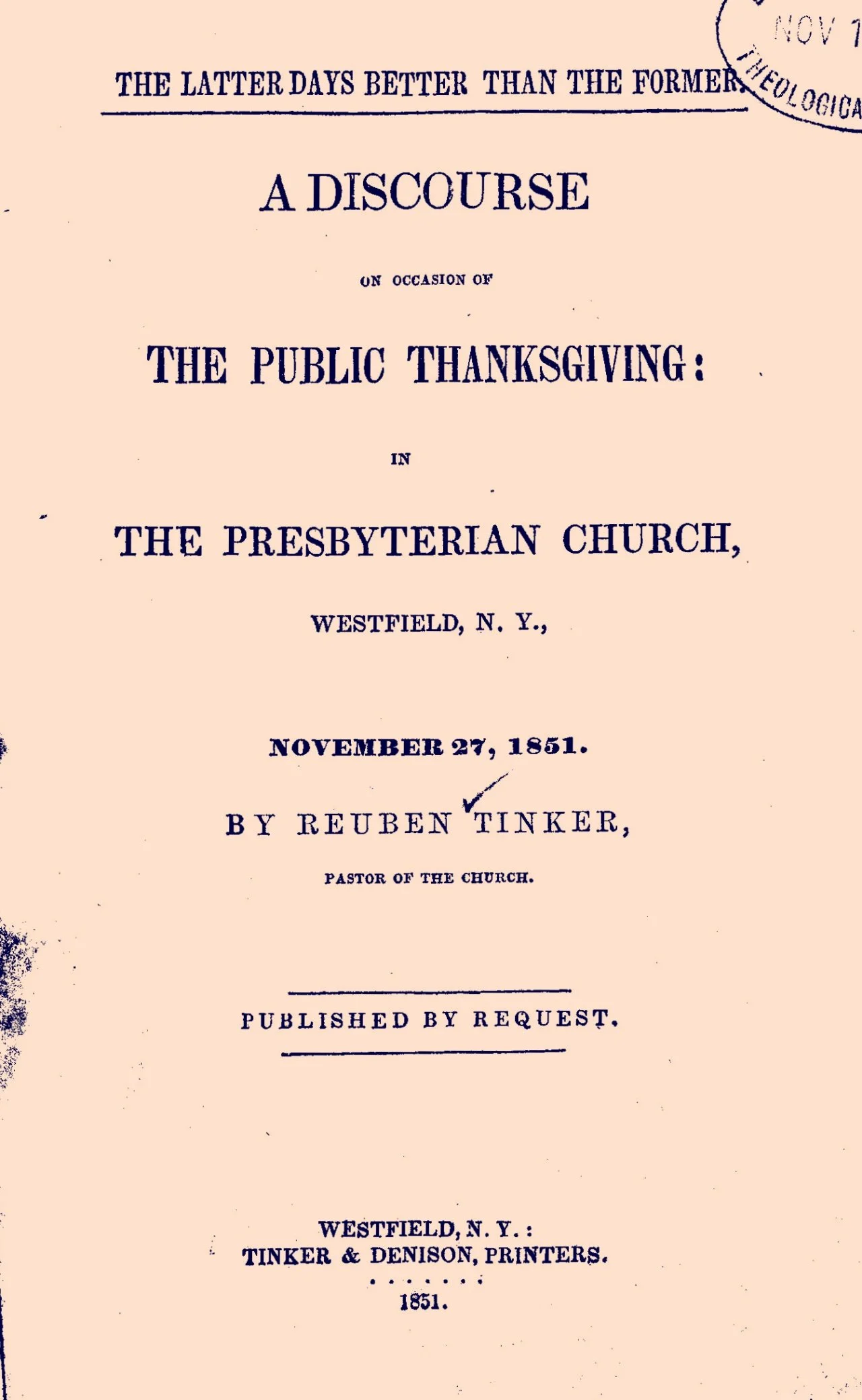 Sermons by Rev. Reuben Tinker, Late Pastor of the Presbyterian Church, in Westfield, N.Y. (1856)