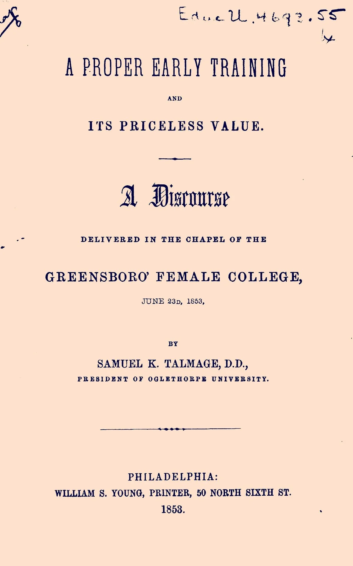 A Proper Early Training and its Priceless Value: A Discourse Delivered in the Chapel of the Greensboro' Female College, June 23d, 1853 (1853)