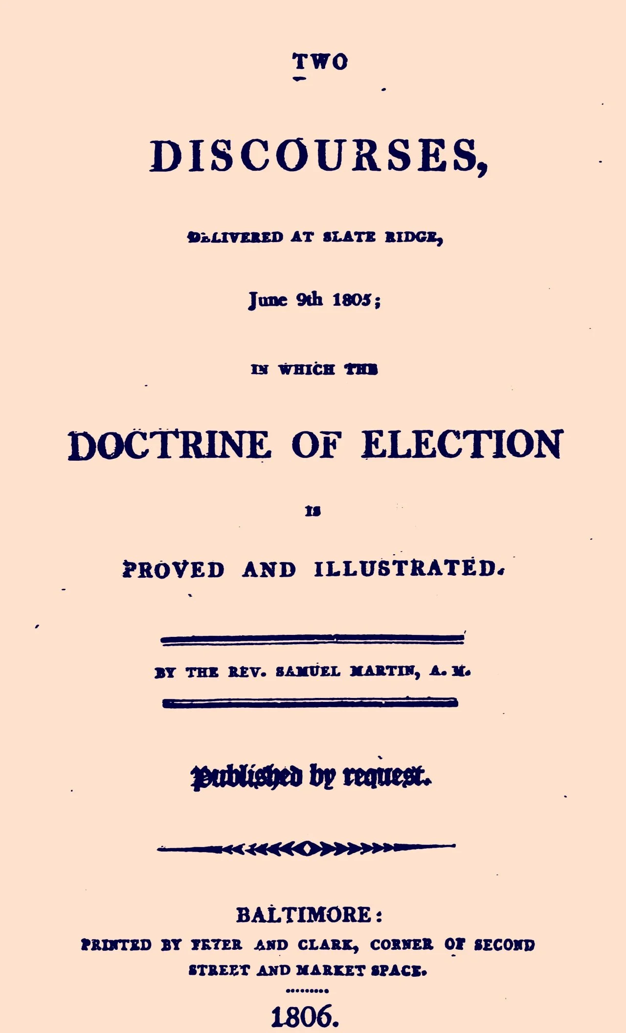 Two Discourses, Delivered at Slate Ridge, June 9th, 1805, in Which the Doctrine of Election is Proved and Illustrated (1806)